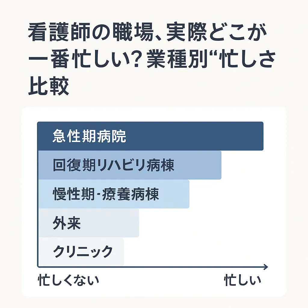 一般的には 急性期病院が最も忙しい とされるが、外来・クリニックでは短時間での業務集中、慢性期では身体介助の負担など、忙しさの性質が異なる。